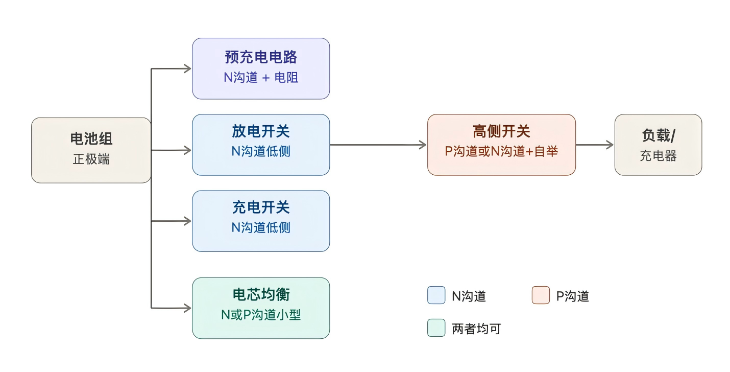 A typical lithium-ion BMS has several distinct switching positions — each with different requirements. The main power path uses back-to-back N-Channel MOSFETs for both charge and discharge control. The pre-charge circuit protects the main switches from inrush current. Cell balancing uses small MOSFETs per cell. High-side positions may use either type depending on gate drive availability.